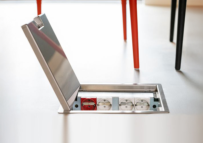 Cajas de suelo para espacios híbridos.Con diferentes tipos de cubiertas, tomas y conectores, garantizan la conectividad en diseños flexibles a una amplia variedad de entornos.